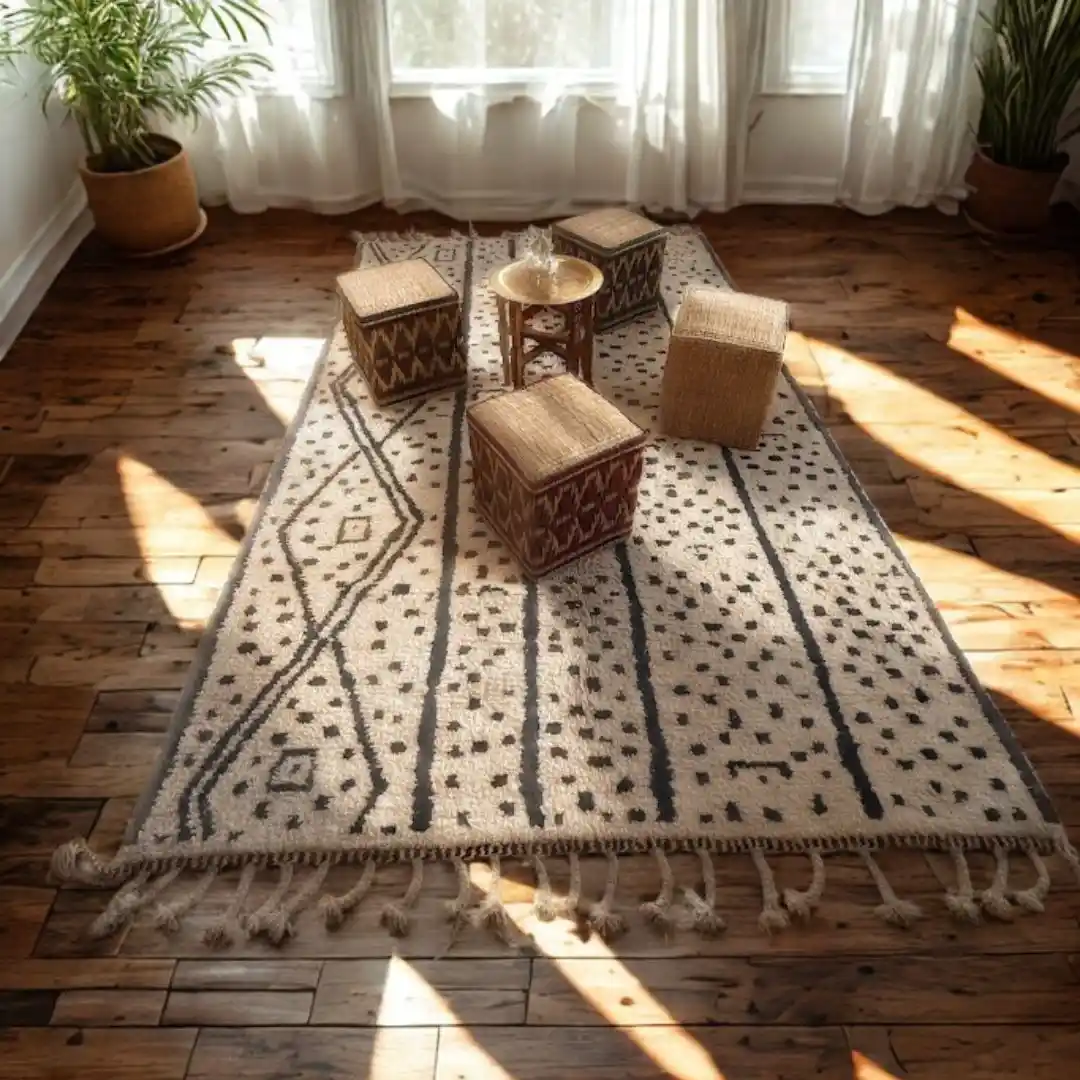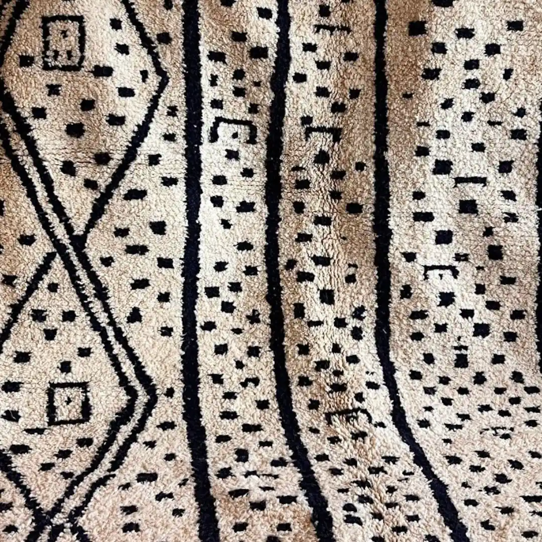 Rankų darbo, ikoninio Maroko Beni Ourain stiliaus, kilimas „Žvaigždėta Sacharos tyla” yra tikras meno kūrinys.