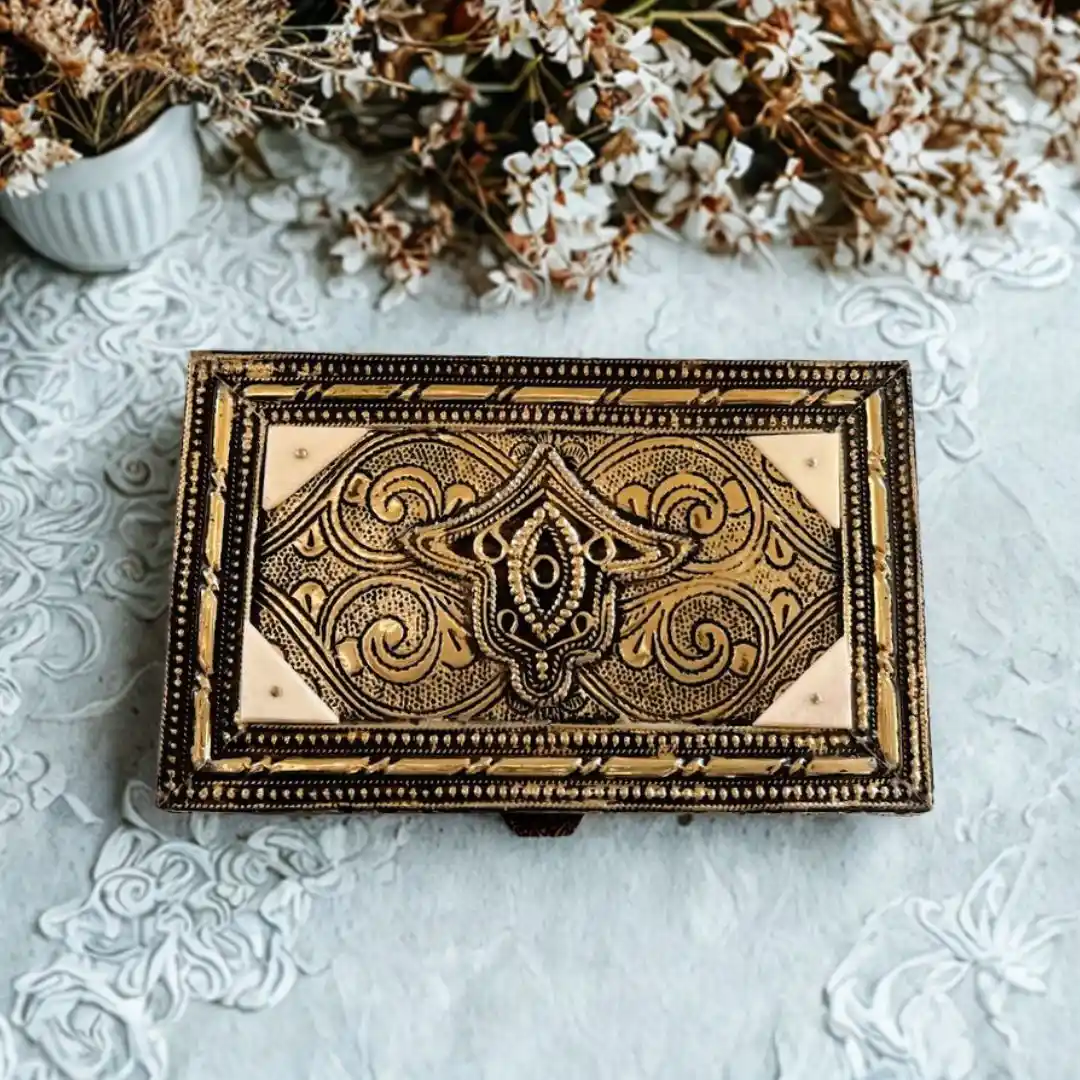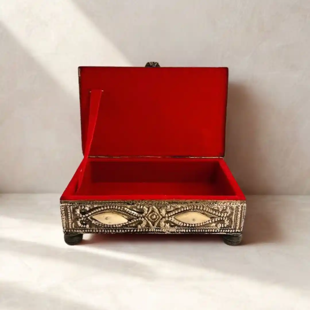 Prabangi skrynelė papuošalams su kalinėto metalo, žalvario ir natūralaus kaulo dekoru – Maroko meistrų Rankų Darbas.