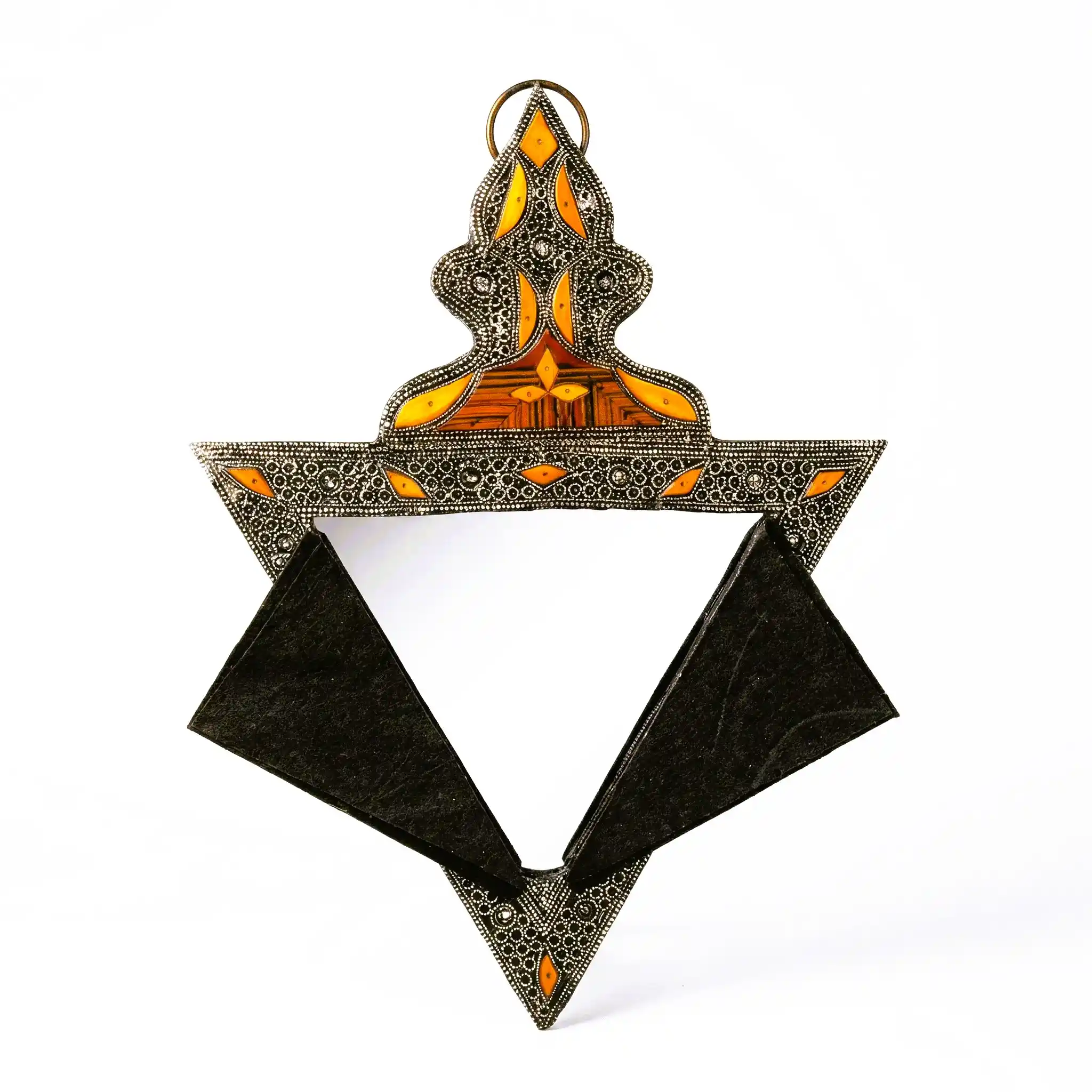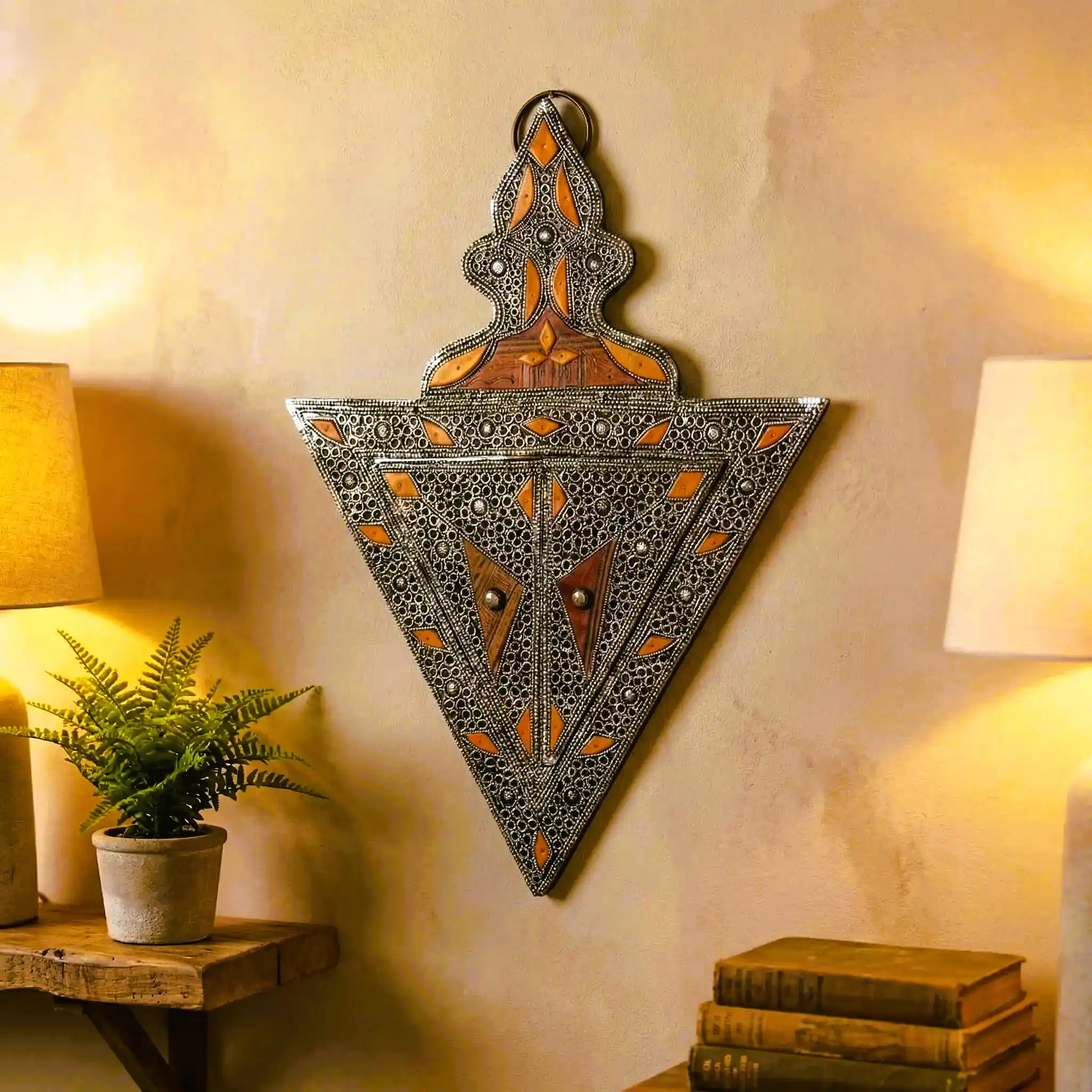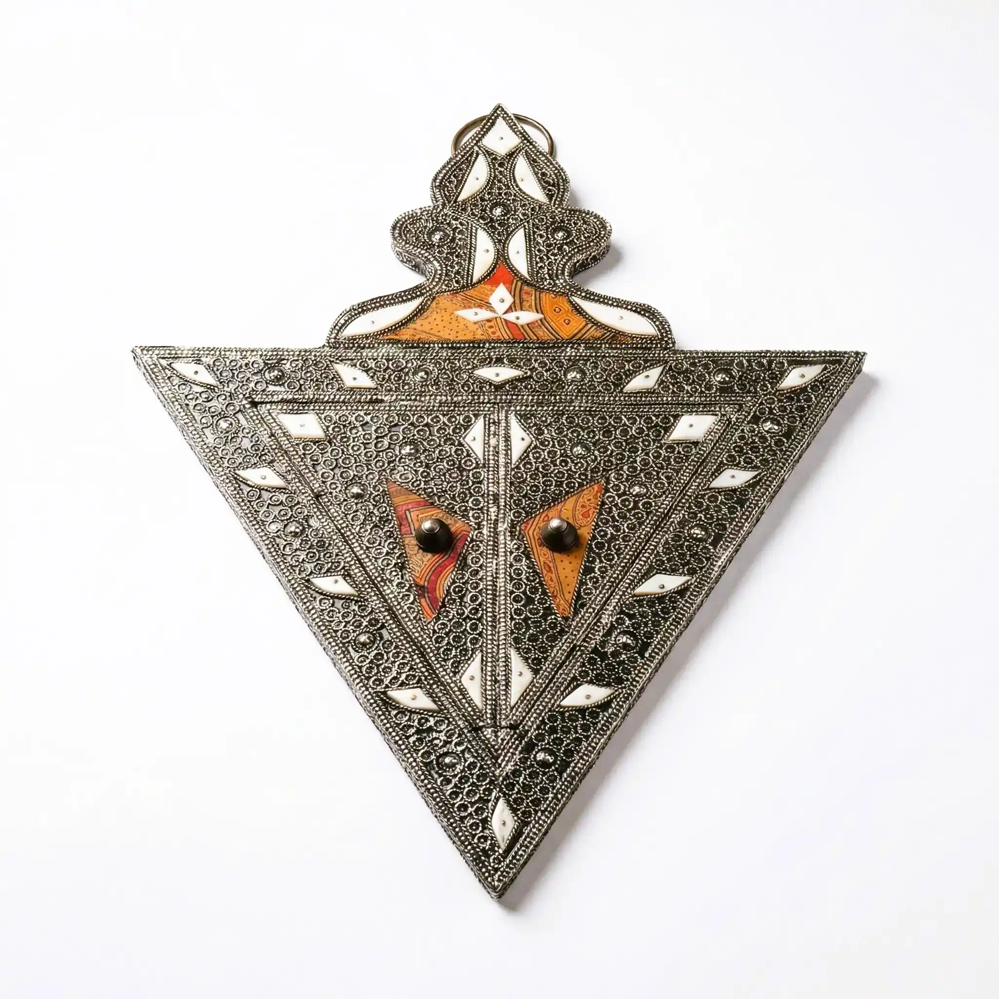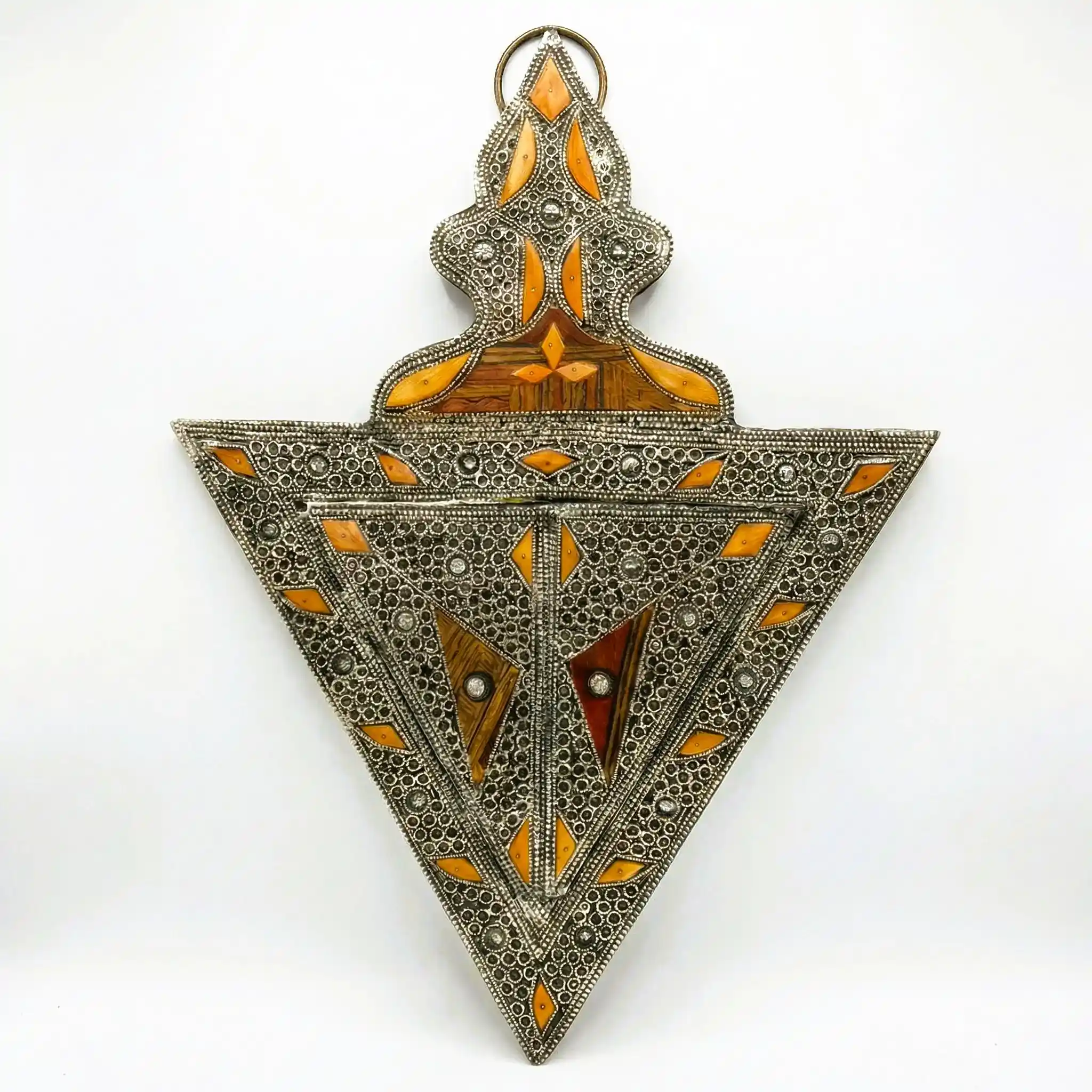 Šis trikampės formos veidrodis, primenantis tradicinius berberų papuošalus yra kruopštus rankų darbo kūrinys, kuriame susipina kalvystė ir preciziška inkrustacija.