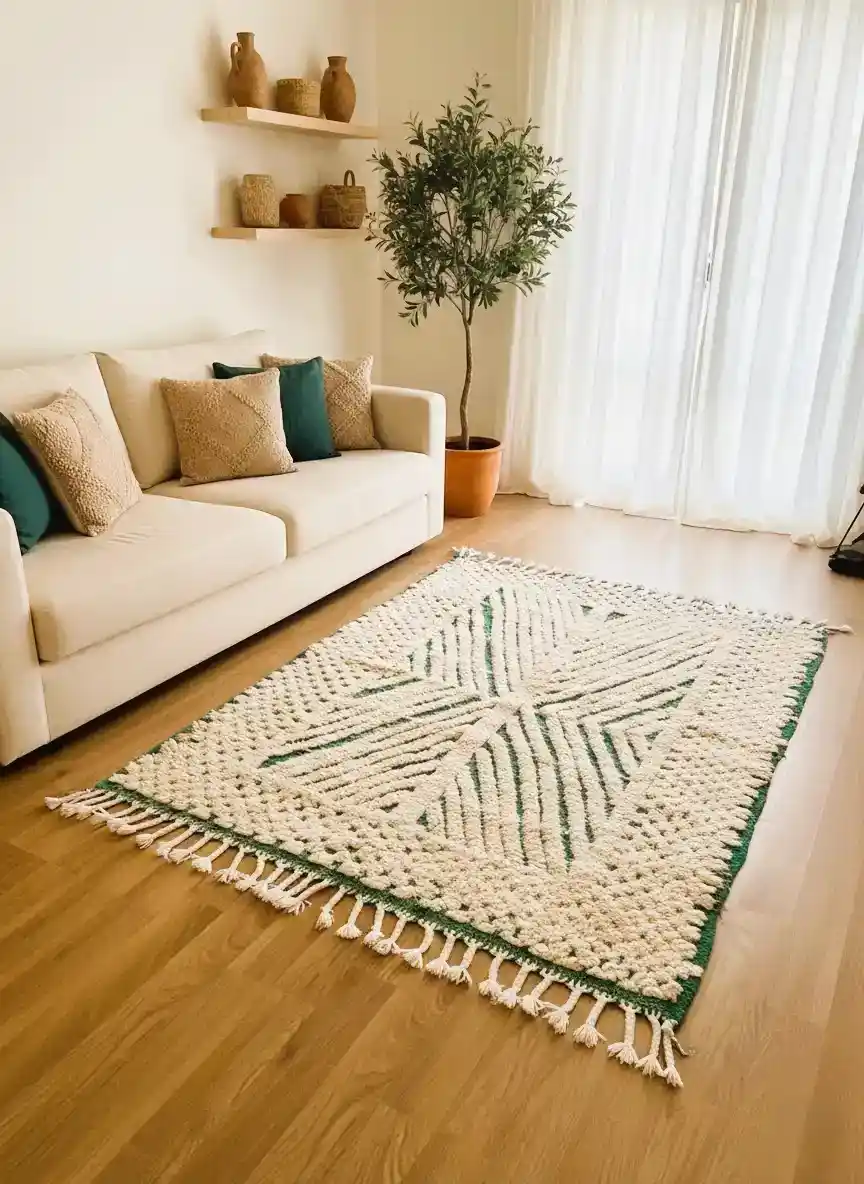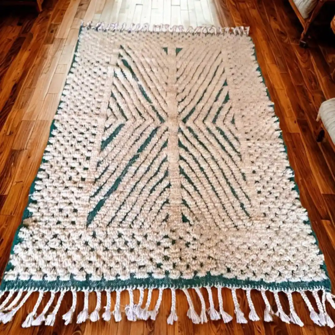Atlaso kalnų audėjų rankų darbo kilimas pagamintas iš aukštos kokybės, natūralios avių vilnos. Kilimas išsiskiria natūralios vilnos baltai-kreminio atspalvio ir subtilios žalios spalvos deriniu bei harmoningais geometriniais raštais.